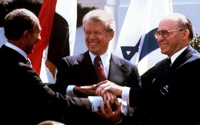 1982年埃及薩達特總統、美國卡特總統(Jimmy Carter)和以色列比金總理在簽署和平條約時握手。(圖片來源:美聯社)
