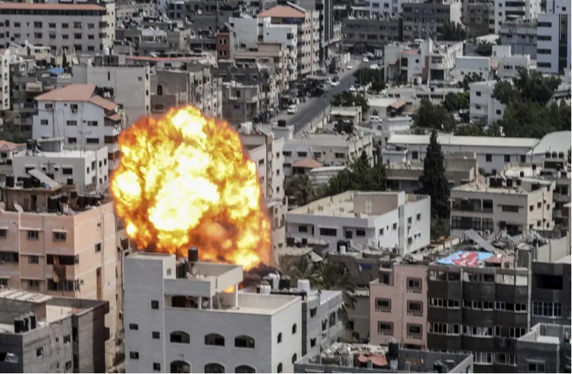 2022年8月6日,以色列空襲加薩市的一棟建築物後,爆發出火球和煙霧。(照片來源:ATTIA MUHAMMED/FLASH90)