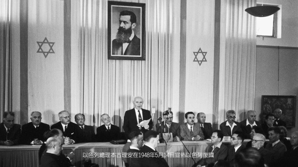 本—古里安站在赫茨爾肖像下宣布復國(照片來源:維基百科)