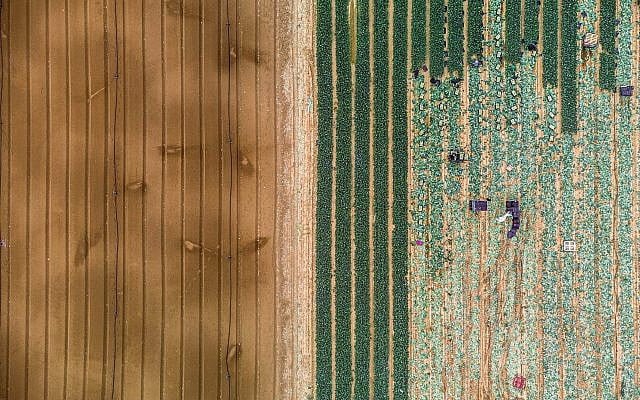 幾十年來,在內蓋夫西部的奧法基姆外的田間收割莊稼,一直是以色列周邊地區的支柱,與其他發展中的工業一樣,現在仍然是人們生計的主要重心。從空中俯視,收割高麗菜的辛苦工作創造了令人驚艷的構圖──紋理、顏色、線條和形狀,只有從鳥瞰的角度才能欣賞得到。