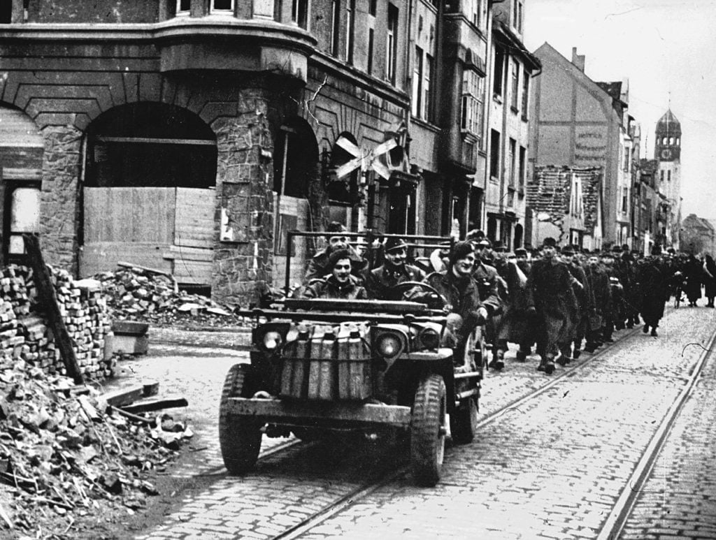 1945年4月,伊恩.哈里斯在德國奧斯納布魯克率領被俘的德國士兵。(帝國戰爭博物館提供)